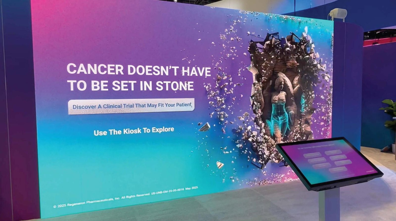 To bring this to life, our 3D artists sculpted life-sized patient figures from digital stone—each representing a disease state within Regeneron’s oncology pipeline. These sculptures, animated and displayed on a massive LED wall at the center of the booth, appeared partially fractured and mid-emergence, embodying both patient resilience and the breakthroughs enabled by Regeneron’s science.