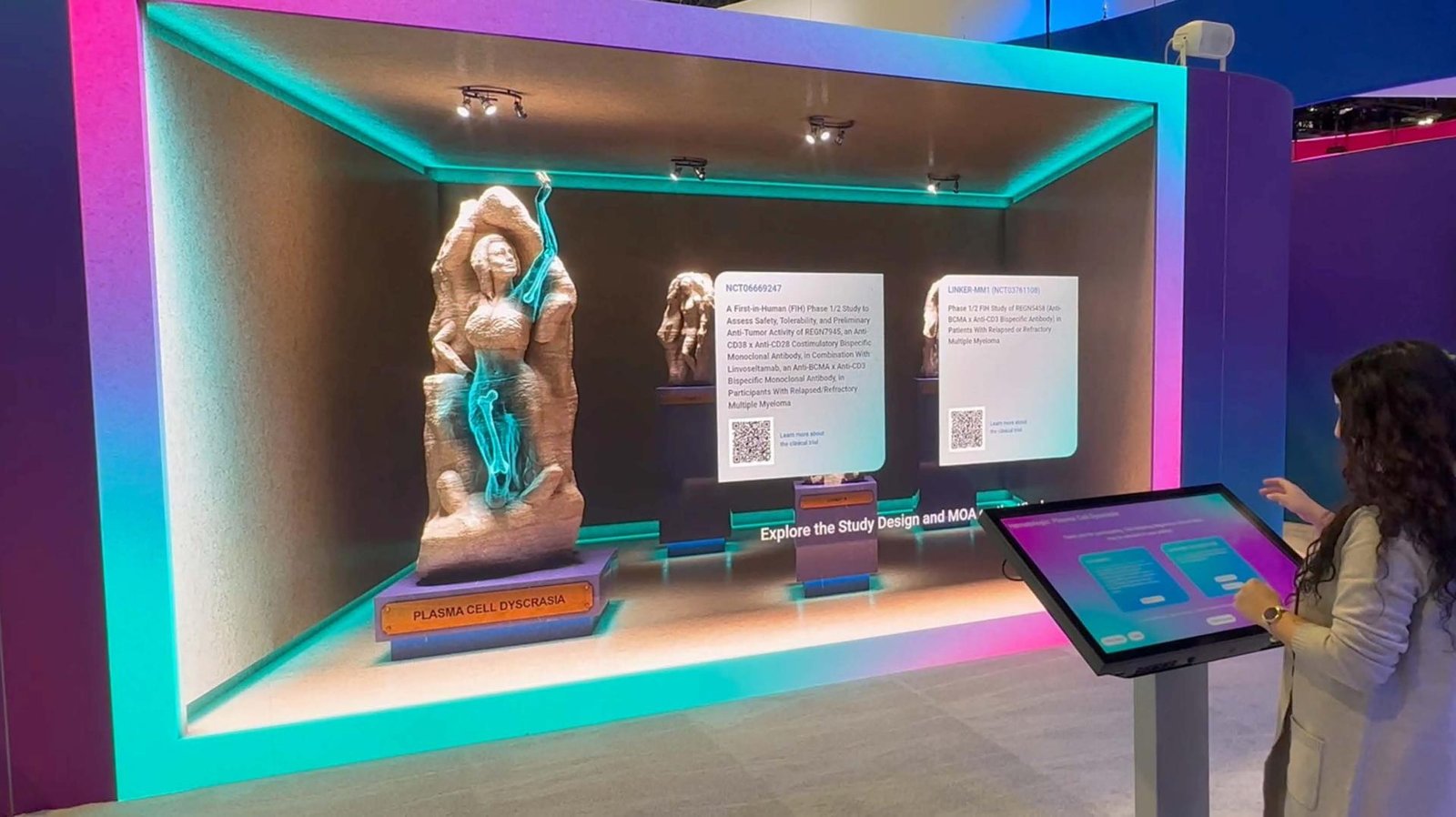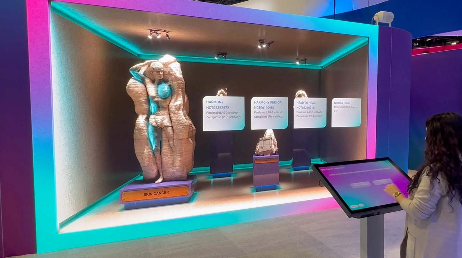 But this was more than visual impact—it was purposefully interactive. HCPs engaged with a touchscreen kiosk that served as a personalized entry point. A curated series of patient-centric questions allowed clinicians to filter and explore trials most relevant to their patients. Each response triggered a dynamic reveal on the LED wall—unveiling a corresponding stone figure and its linked clinical trial. This seamless interaction elevated the experience from static content to a personalized, intuitive journey—empowering HCPs to discover, connect, and act with clarity.