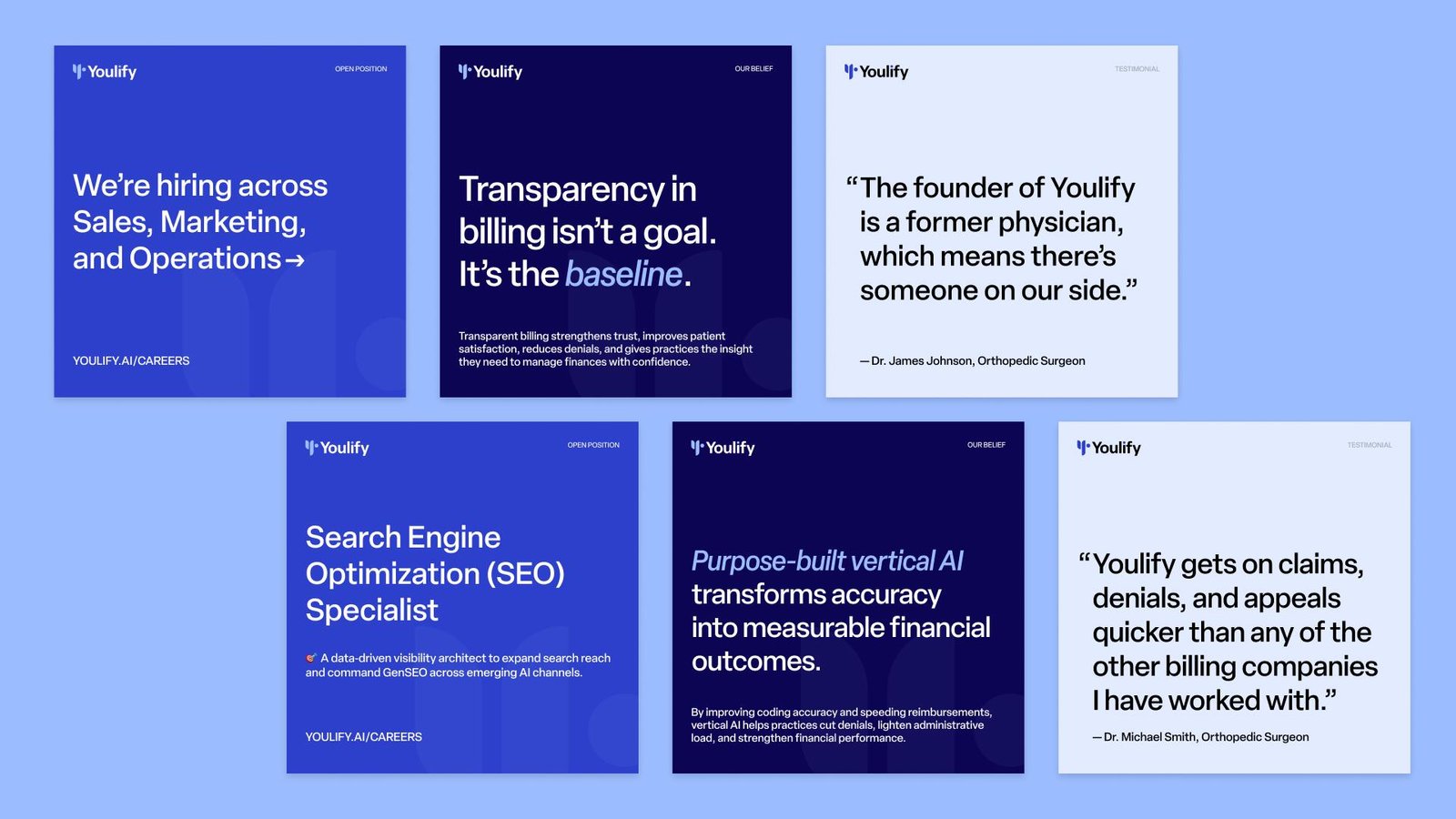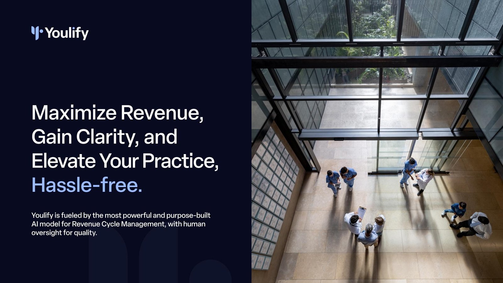 Youlify reframes the narrative around clarity, speed, and trust. Built by physicians for physicians, our brand positions revenue cycle management not as back-office paperwork but as the heartbeat of a thriving practice.