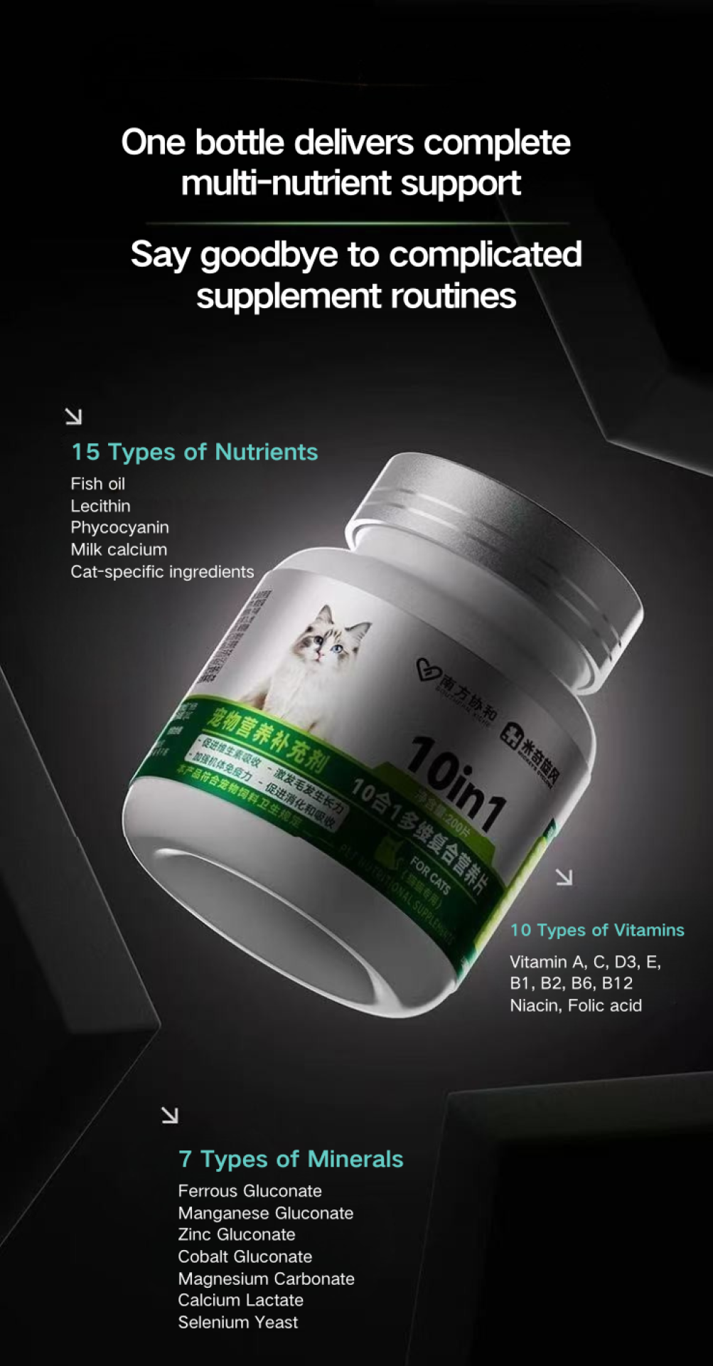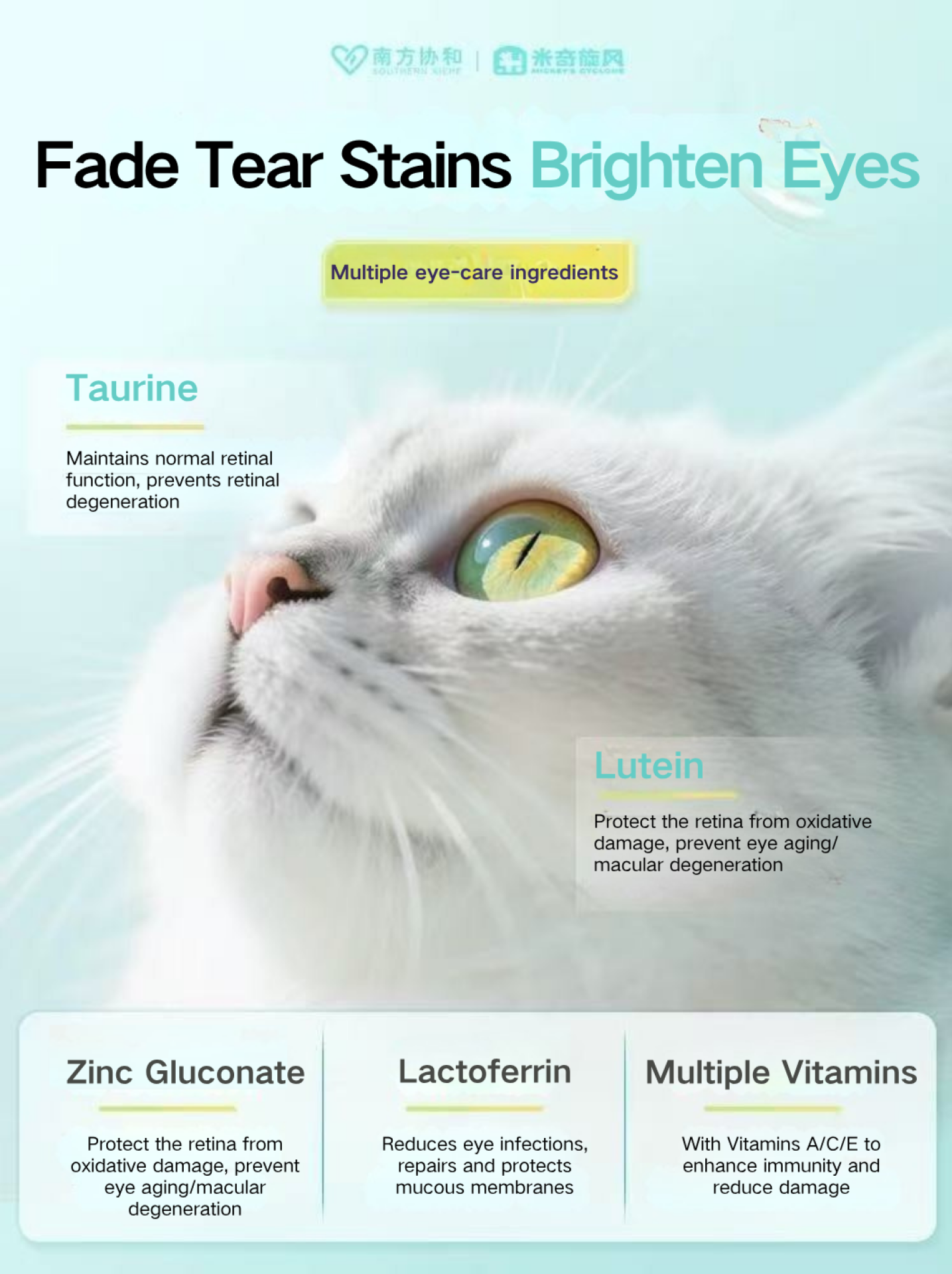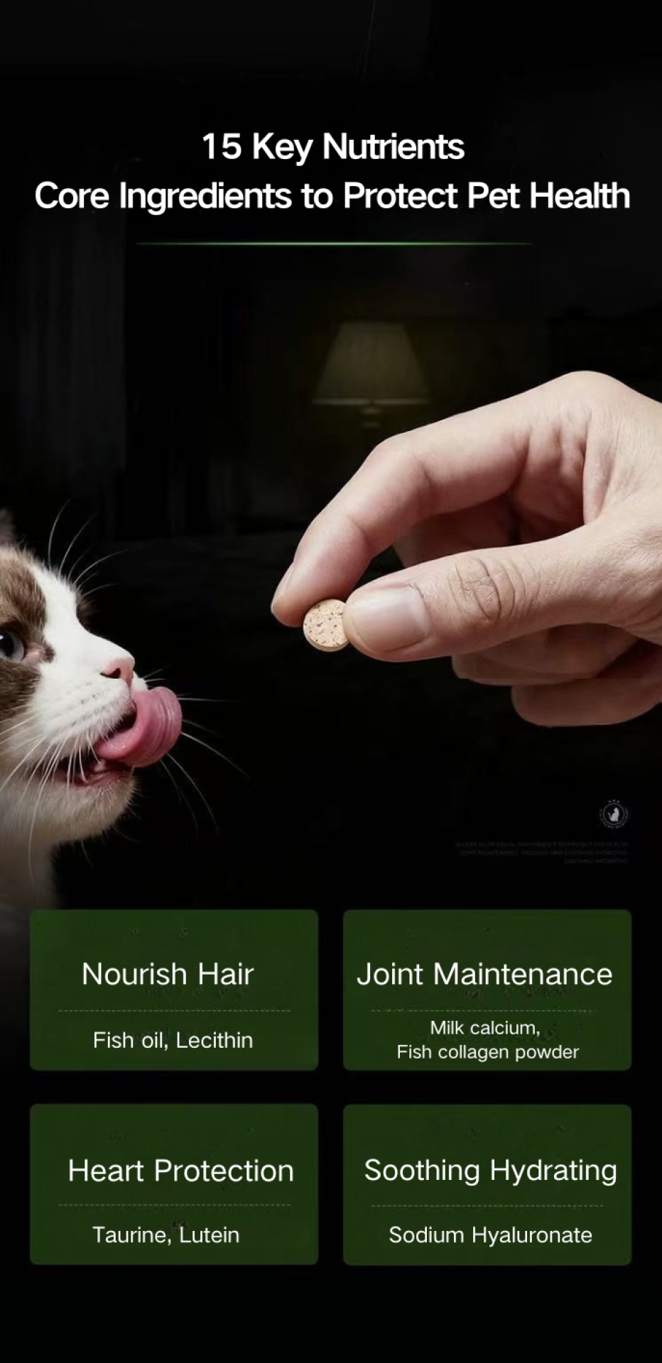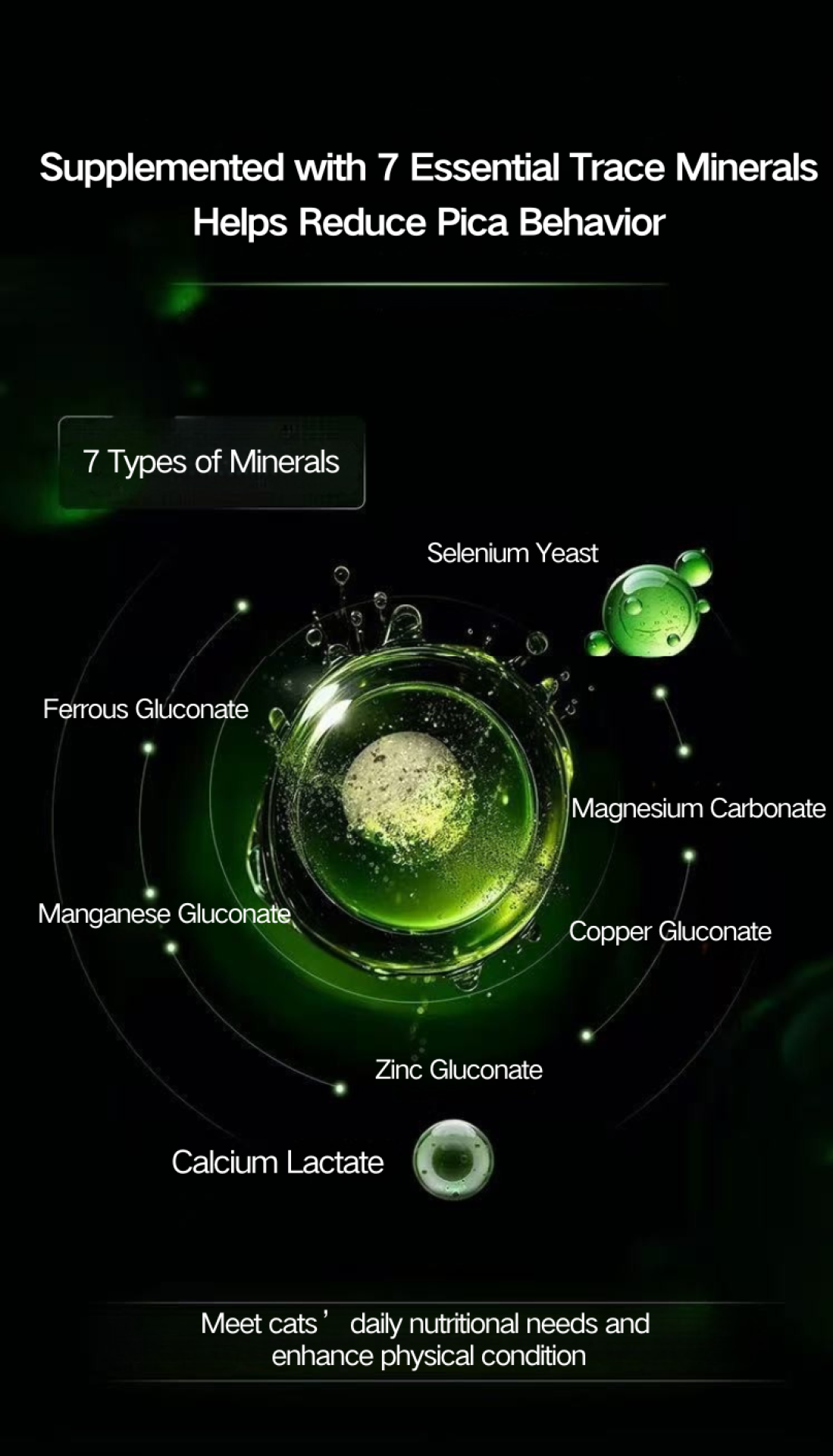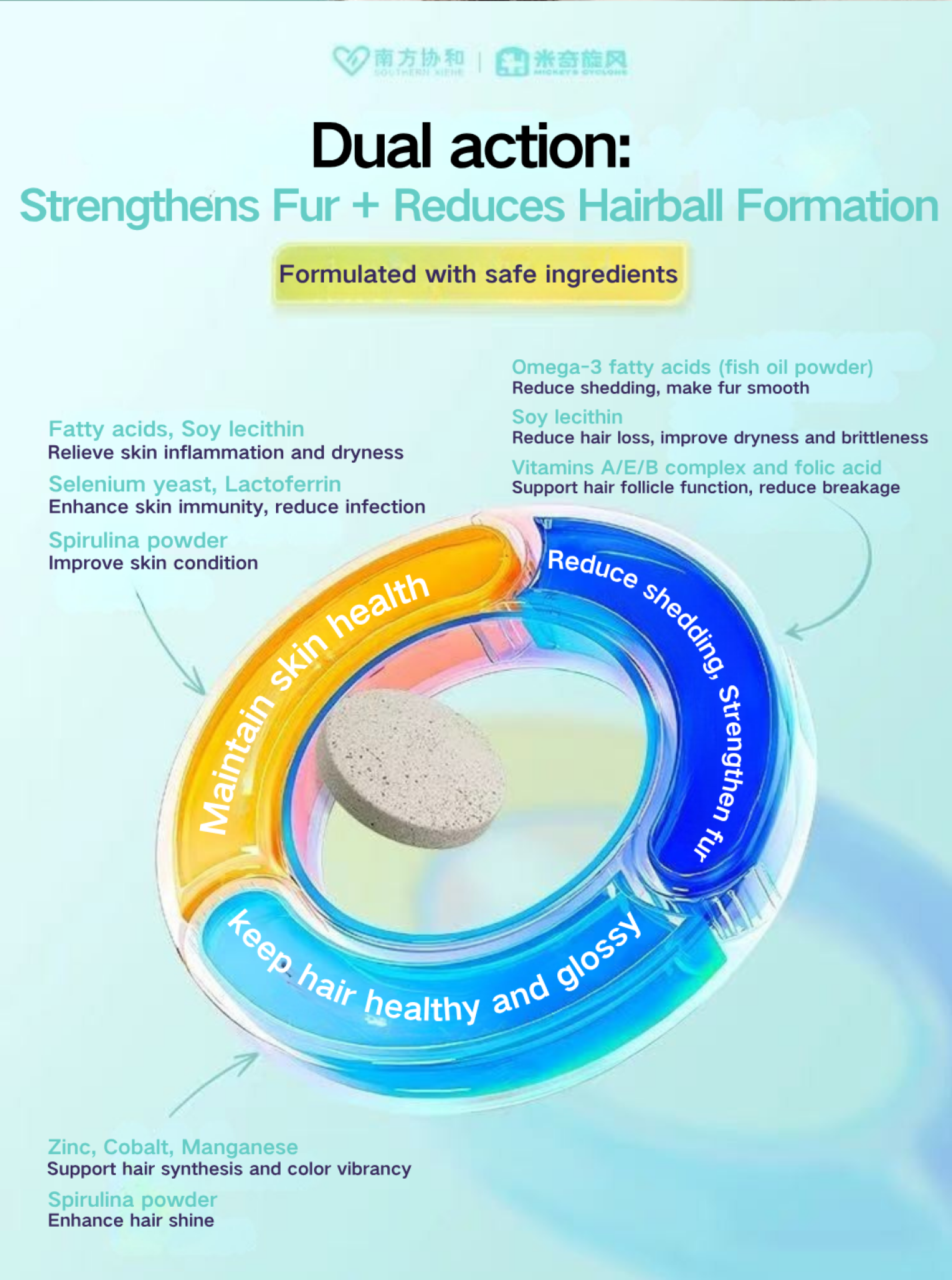 The MICKEY’S CYCLONE Pet Multivitamin Supplement scientifically integrates 15 functional nutrients, 10 essential vitamins, and 7 highly absorbable minerals, including cat-critical compounds such as fish oil, lecithin, phycocyanin, bovine lactium calcium, taurine, lutein, hyaluronic acid, and fish collagen peptides. This comprehensive matrix targets core pet health dimensions: hair vitality, eye and heart protection, skin hydration, joint and bone development, immunity enhancement, and digestive stability, forming a full-lifecycle nutritional support system. To specifically address trace-mineral gaps and pica tendencies, the product uses seven mineral forms that are easier for pets to absorb (e.g., ferrous gluconate, zinc gluconate, manganese gluconate), improving daily mineral uptake and overall resilience.