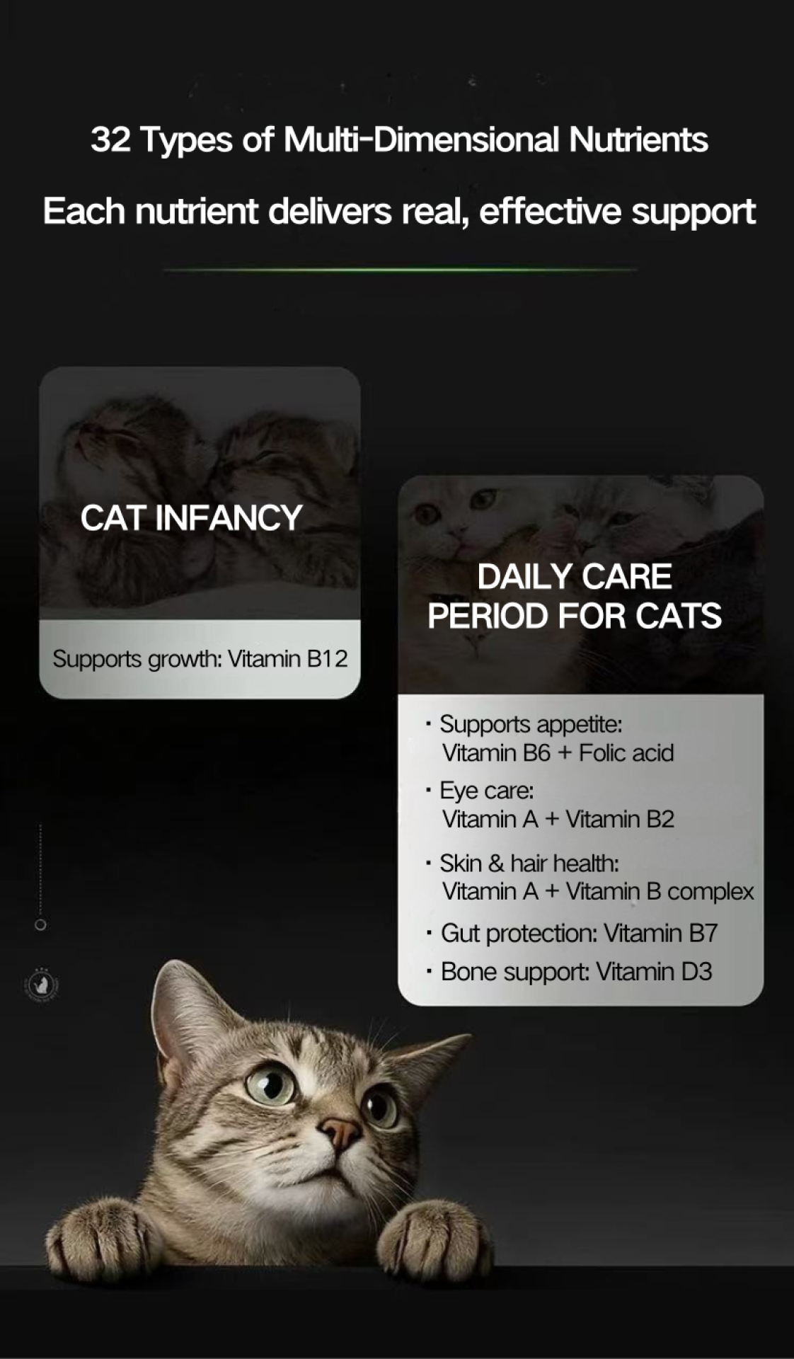 Life-stage and functional care are strategically mapped: Vitamin B12 supports early growth; B6 and folic acid enhance appetite; Vitamins A and B complex improve skin and coat quality; A and B2 support vision; D3 strengthens bone development; B7 reinforces gastrointestinal health—ensuring precise, evidence-based health intervention.