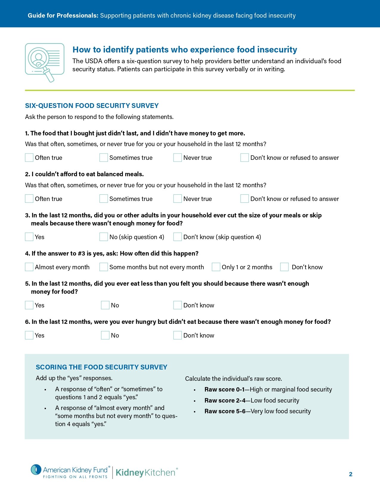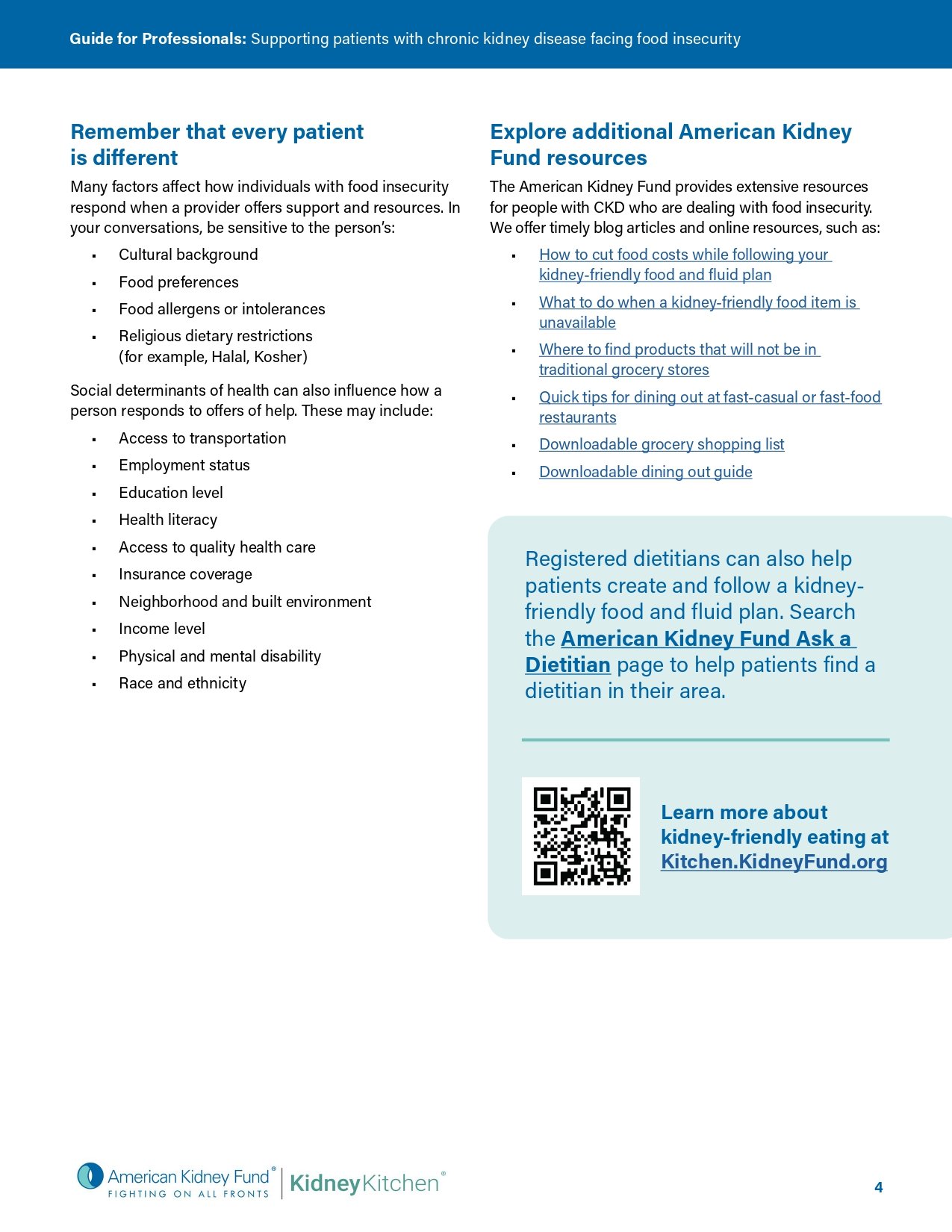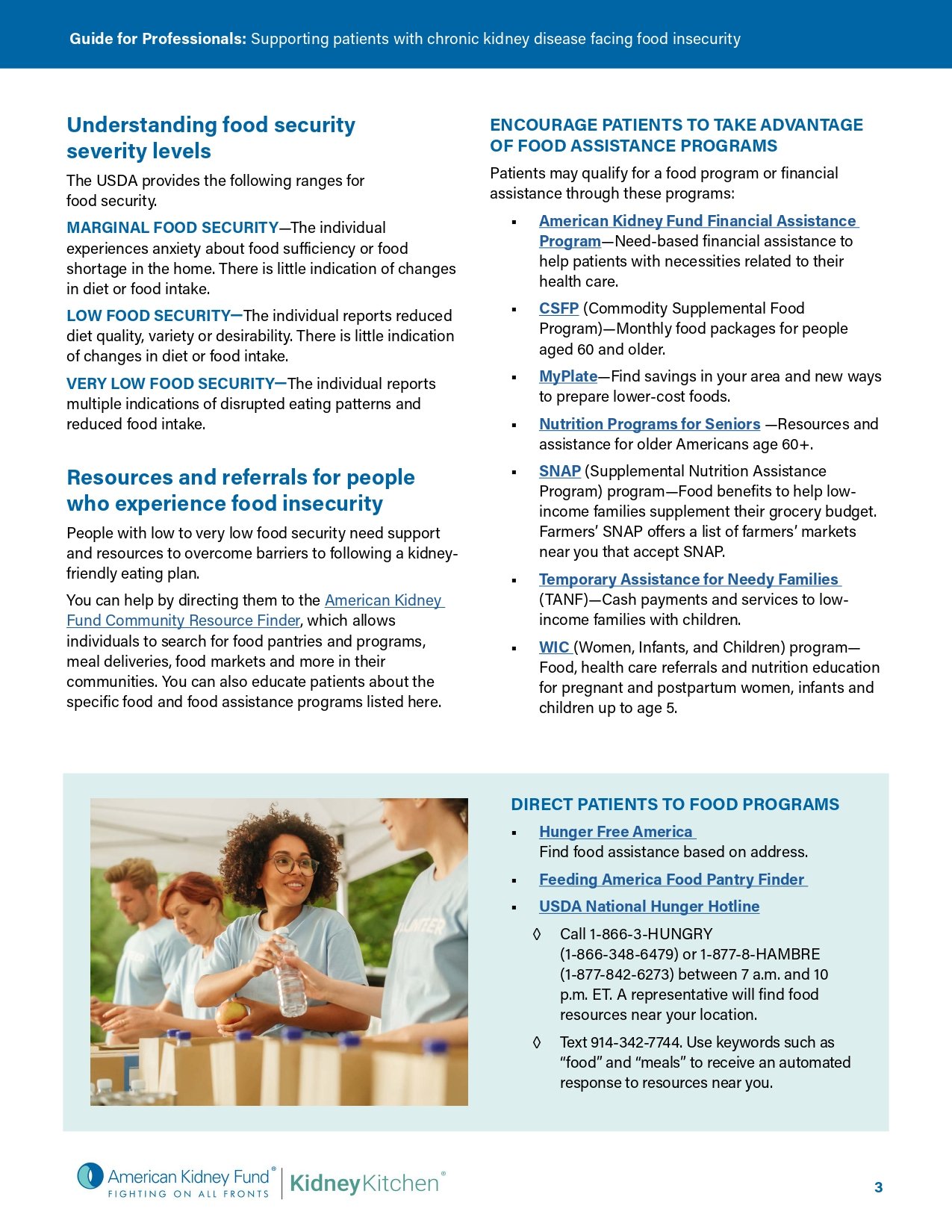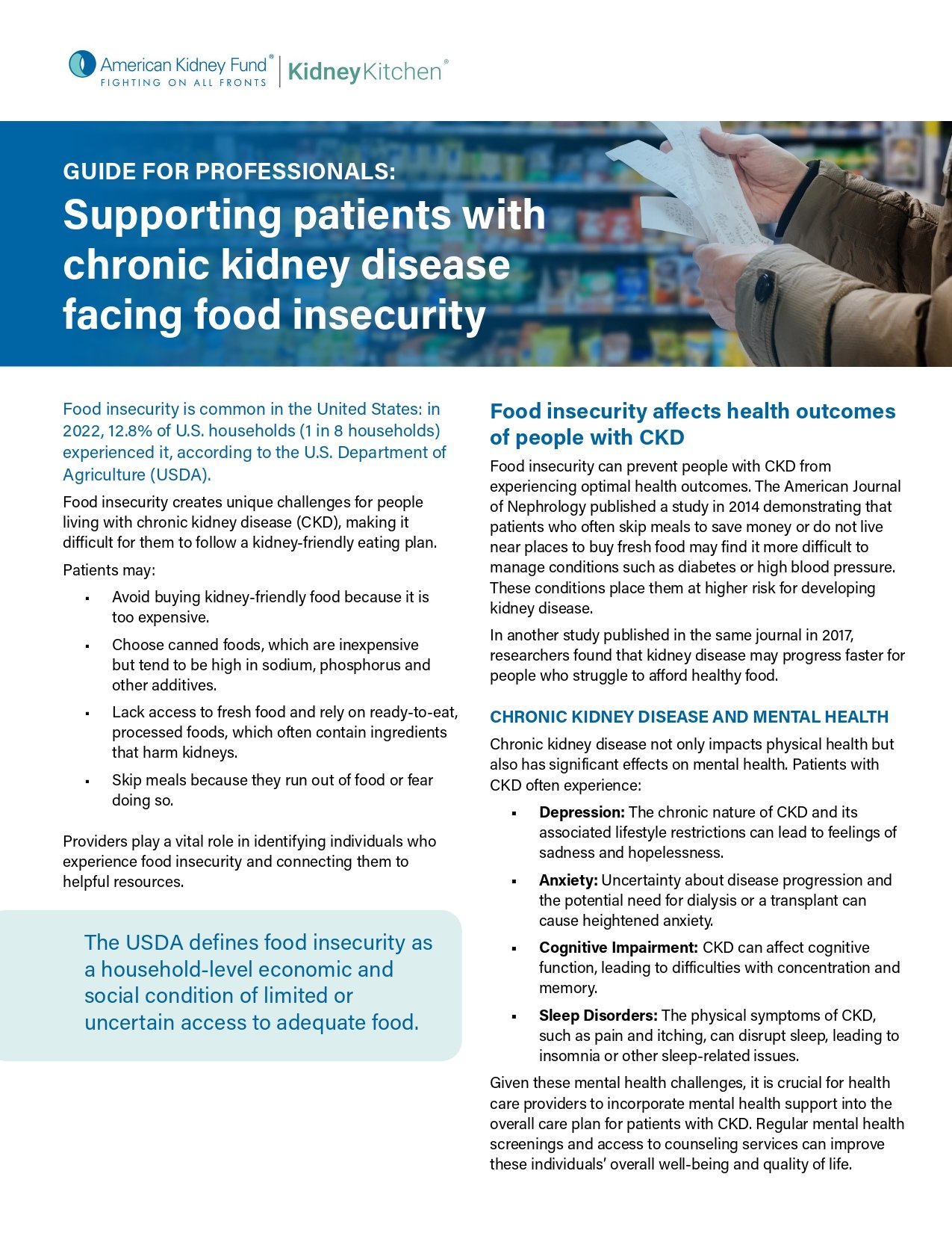 Food insecurity is common in the United States: in 2022, 12.8% of U.S. households (1 in 8 households) experienced it, according to the U.S. Department of Agriculture (USDA). Food insecurity creates unique challenges for people living with chronic kidney disease (CKD), making it difficult for them to follow a kidney-friendly eating plan. This guide provides healthcare professionals with tips to help their patients navigate these difficulties.