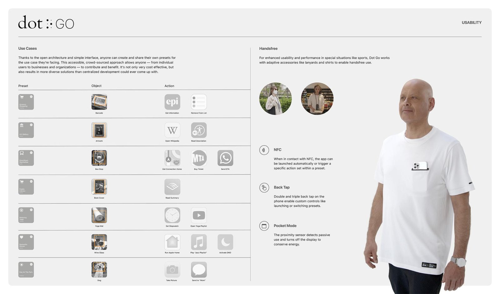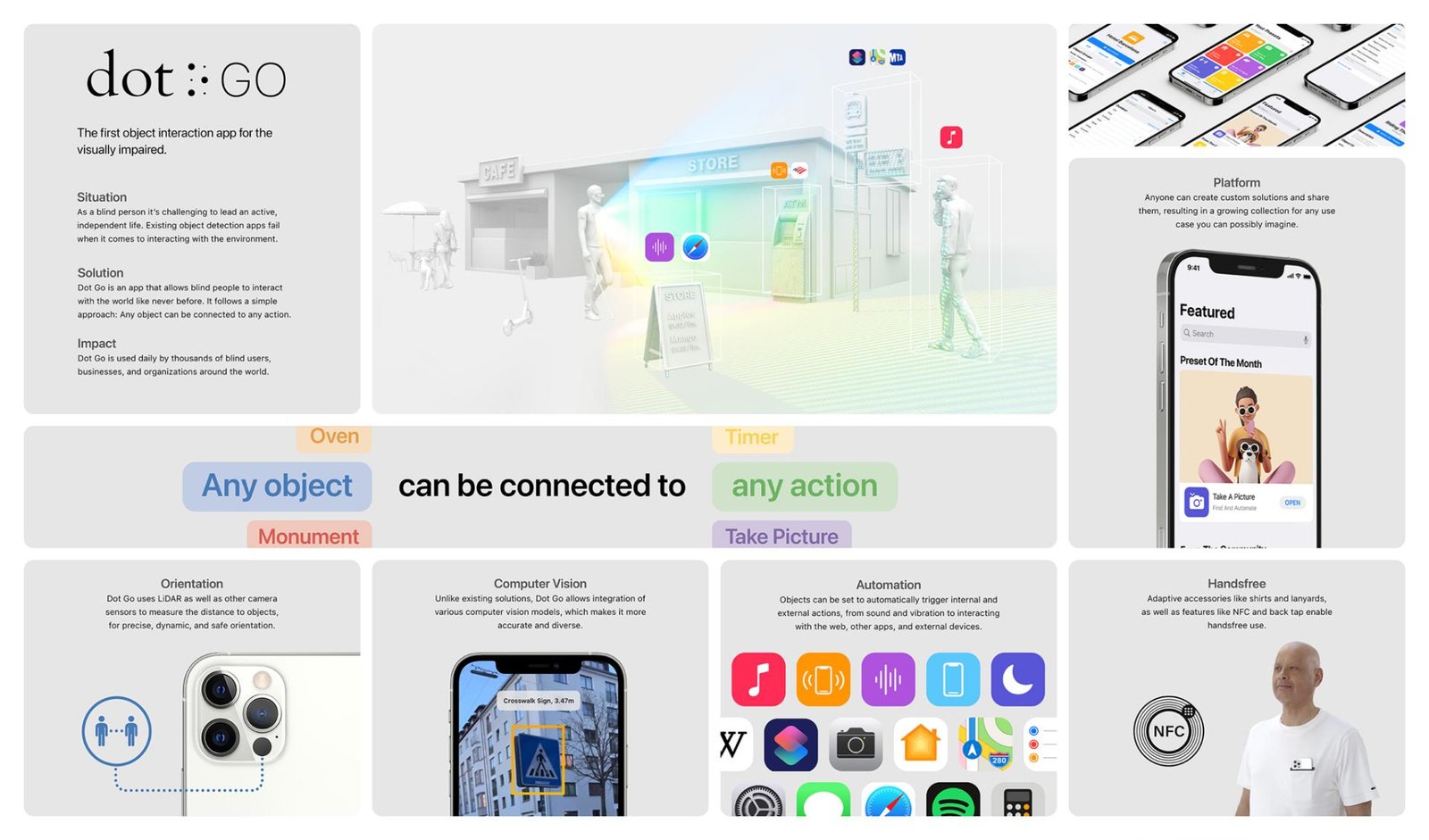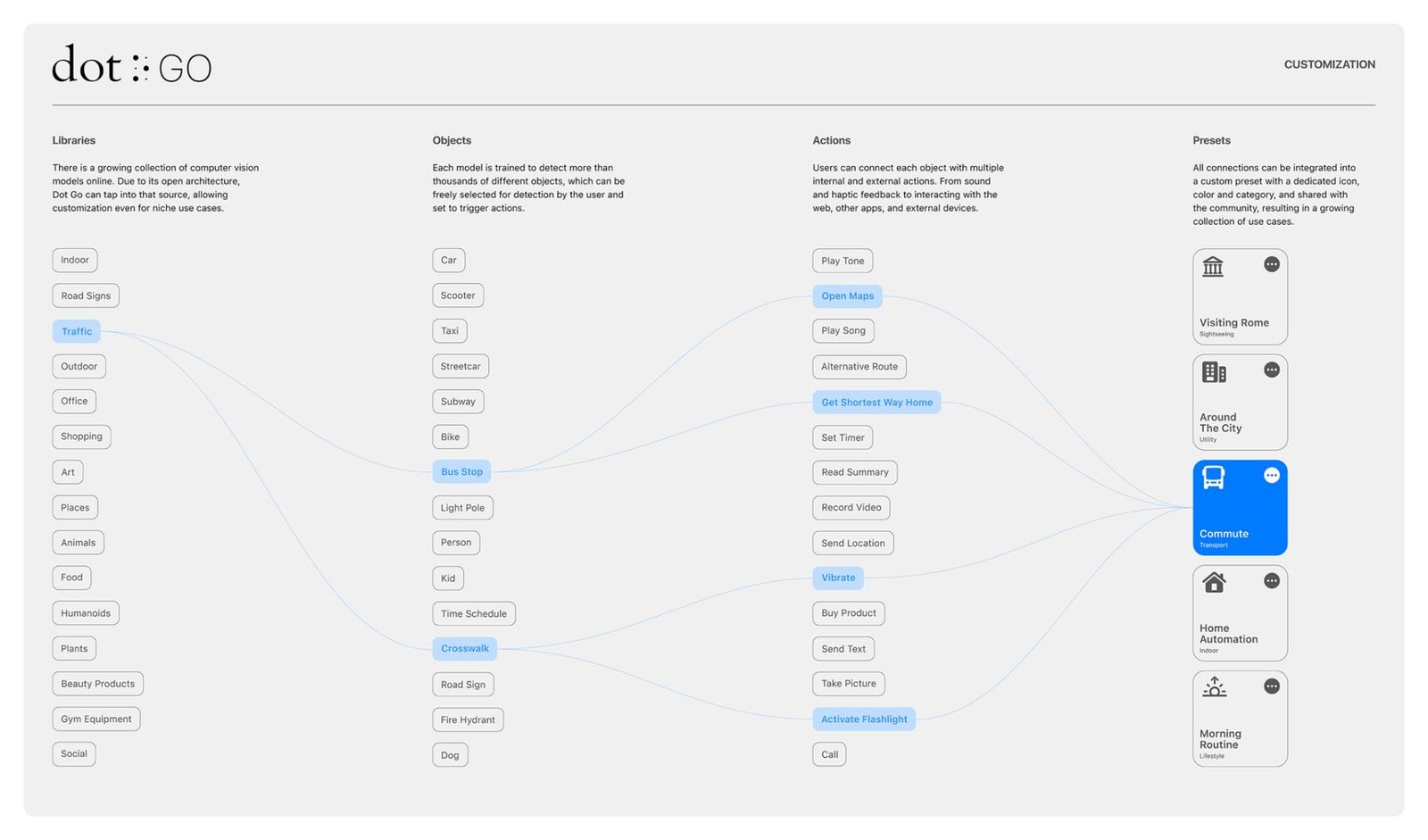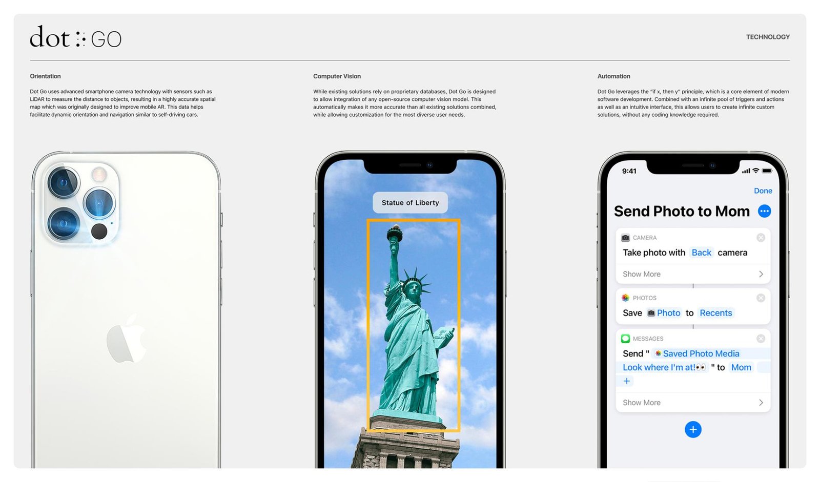 By leveraging open-source computer vision models and the camera sensors to detect distance, Dot Go serves as a toolkit for accessibility. More than an app, it’s a platform, allowing everyone to customize for objects, locations, and needs, creating a growing library of use cases curated by users, institutions, and brands.